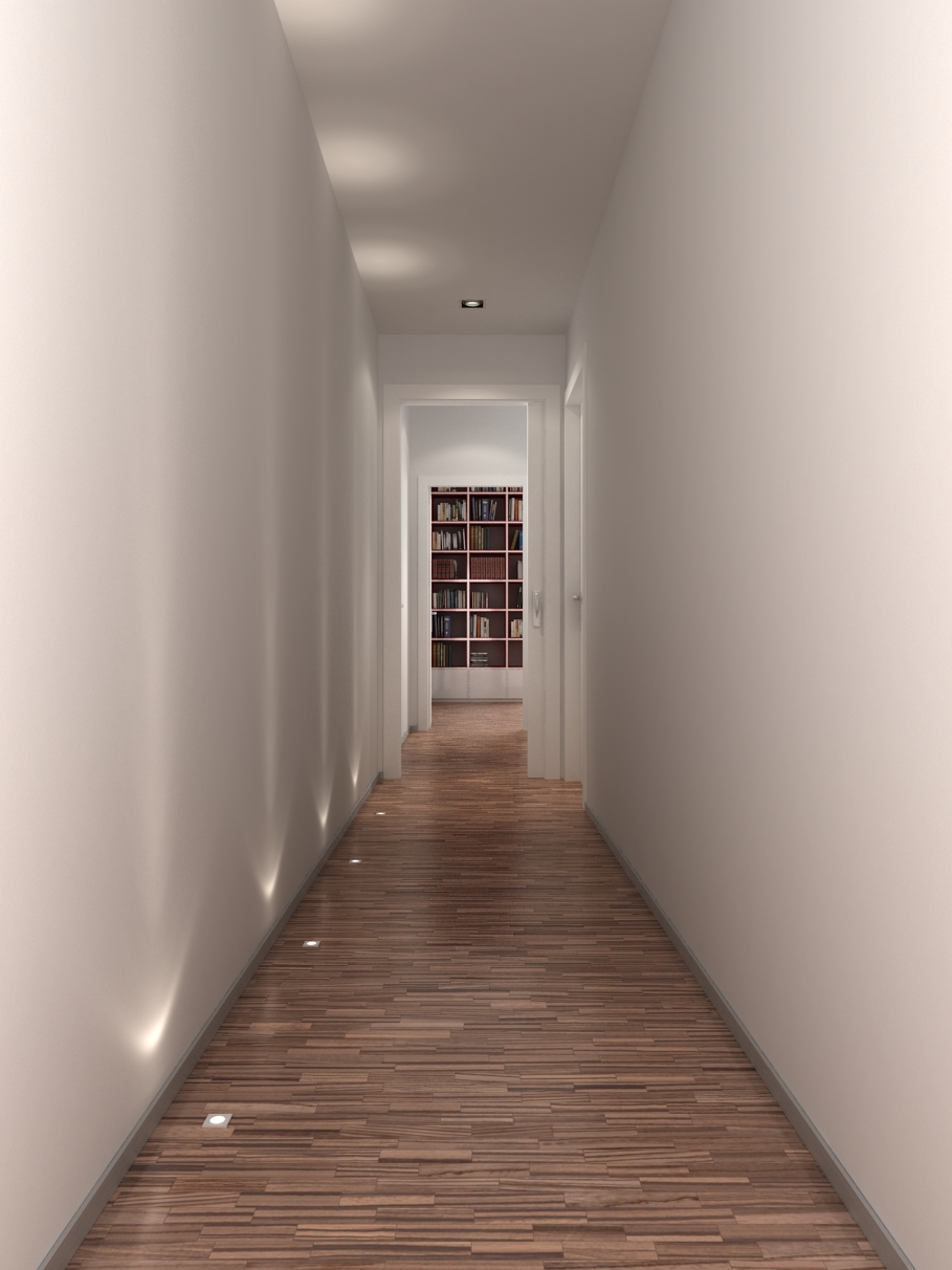 Il corridoio secondo me funziona bene anche così, eviterei quadri o altre cose appese che ostruiscono i fasci di luce, se proprio, e ripeto SE, giocherei col tipo di finitura dell'intonaco