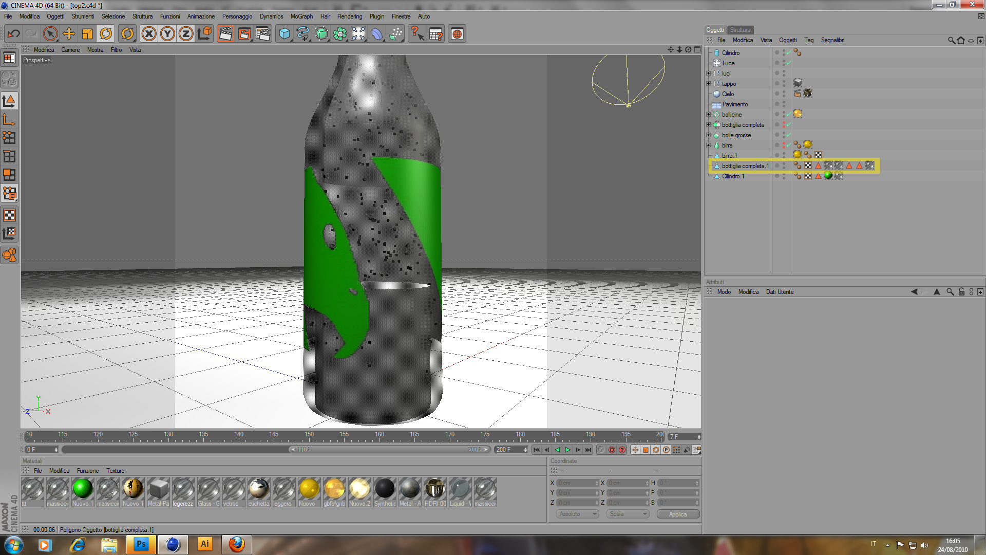 Sulla bottiglia ho messo un materiale vetro, poi ho duplicato il materiale ed ho apportato qualche modifica. Ho inserito la superficie acqua nell'opzione rilievo e modificato la grandezza della texture. Ho fatto più copie del materiale perchè poi con delle varie selezioni ho applicato in alto delle goccie più piccole ed in basso più grandi. In poche parole sullo stesso pezzo ci sono tre materiali di vetro ma gli ulti due sono modificati e sui quali ho applicato mixa texture.