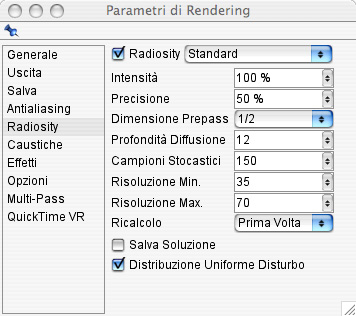 Per i parametri del radiosity ho utilizzato una precisione del 50% e dimesione del prepass del 1/2 per ridurre i tempi ed avere un'imediata idea del tipo di illuminazione che potevo avere nelle rispettive stanze