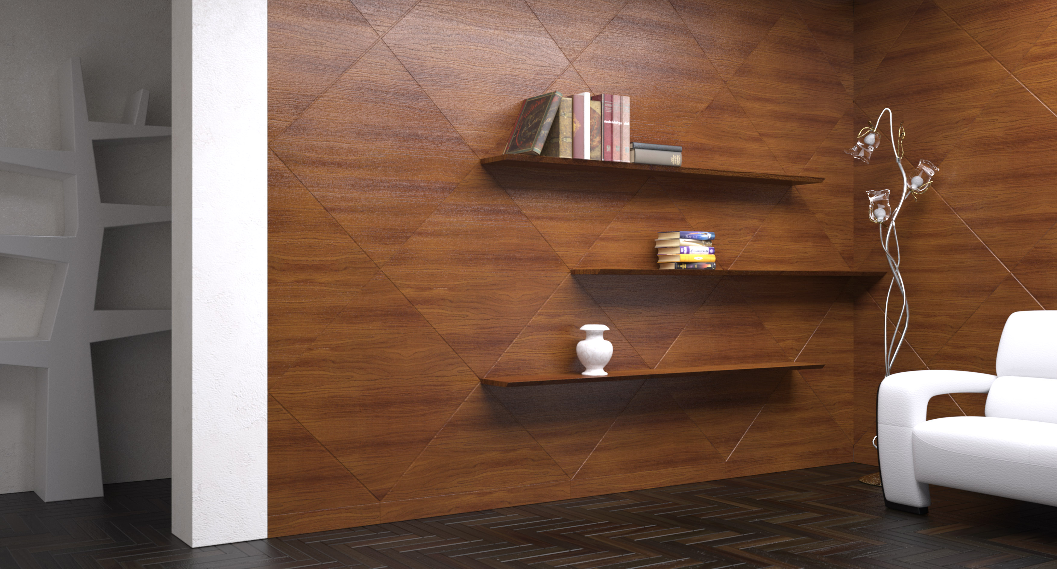 secondo me l'illuminazione è davvero ben riuscita, l'appunto che ti posso fare è esclusivamente un accorgimento che potresti adottare ma è da provare perchè non so se poi andrebbe effettivamente a migliorare l'immagine, ma una prova la si può sempre fare, ovvero prova ad inserire un emitter con un wattaggio molto basso ed un colore caldo, tendente al giallo/arancio ed inserirlo dietro la parete di legno, di modo da andare a simulare la luce del "ripostiglio" dietro la parete, inoltre inserendo questo ulteriore emitter sicuramente andresti a pulire più velocemente il materiale bianco dello scaffale e secondo me creeresti maggiore "movimento" per quanto riguarda l'illuminazione, ma ti ripeto è tutto da testare è solo un ipotesi, davvero complimenti hai fatto passi da gigante