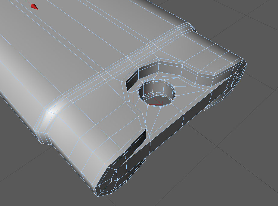 Poi ho estruso, modellandoli dei poligoni per la "coda", quindi ho realizzato lo spessorino unendo dei poligoni della curvatura con lo strumento "Bridge" o "Ponte", quindi ho realizzato le suddivisioni per il buco.