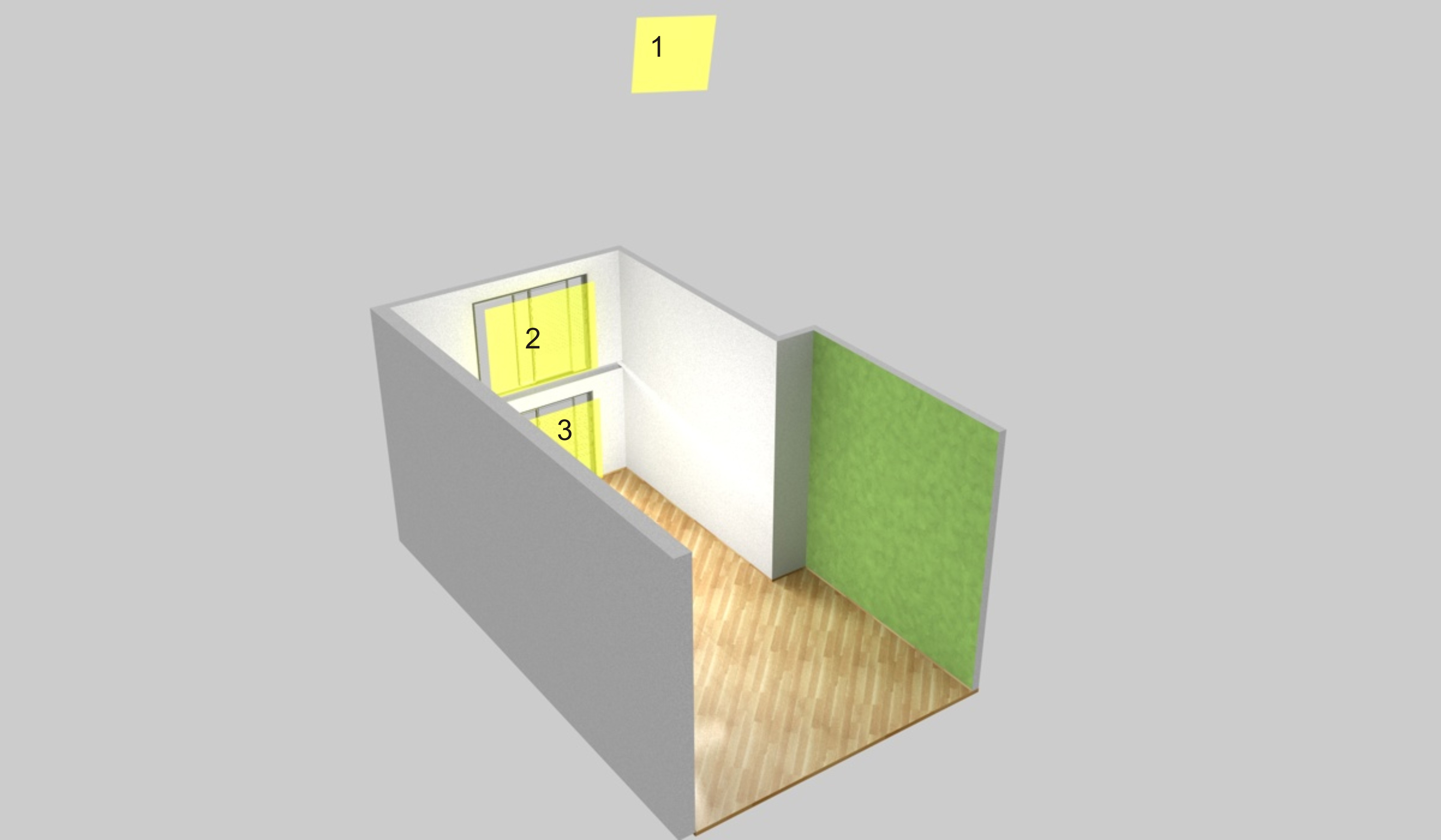 Grazie dei consigli ragazzi, siete stati molto utili. Vi allego lo schema della stanza e dell'illuminazione. Questo è un render fatto velocemente seguendo un po i vostri consigli. Luce infinita (nell'immagine luce 1) con ombreggiatura area attivata e intensità 150% , due luci area in prossimità delle due bucature (nell'immagine luce 2 e 3) con intensità 100% ombra area.E' venuta un po scura questo lo so,è un render bozza. la cosa che non mi convince tanto sono le due ombre di ciascun oggetto che si estendono in due diverse direzioni (ombre generate dalle due luci area in diverse posizioni). Che dite?? voglio specificare, se faccio qualche grossa stupidaggine nelle impostazioni o dico qualche corbelleria mostruosa, non ne capisco niente di illuminazione, fino ad oggi mi sono limitato nella modellazione. Vi ringrazio in anticipo, mi state dando una grossa mano a capirci qualcosa