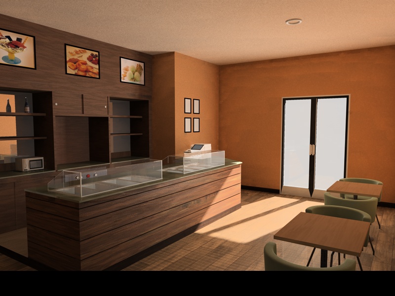 Salve a tutti. ho questa scena dell'interno di una gelateria da me creata, mi piacerebbe avere dei consigli sul tipo di illuminazione, specie per quanto riguarda le luci artificiali sul soffitto e quelle che andrebbero ad illuminare il bancone per le bottiglie, queste punti li ho indicati nell'immagine con dei punti gialli.