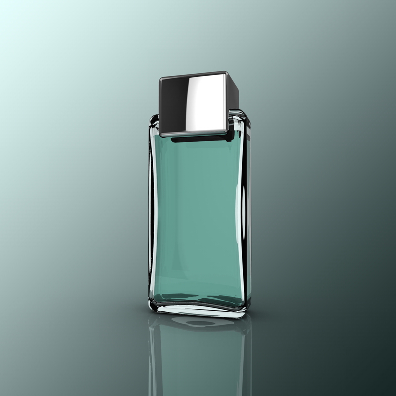 Questo è il massimo che sono riuscito ad ottenere con un HDRI mappato su una sfera per l'illuminazione, un piano per le riflessioni compositato con uno sfondo in modo che si veda solo la riflessione per terra (in pratica stesso materiale dello sfondo ma con la riflessione spuntata; il resto lo fanno i TAG Compositing) ed il profumo!