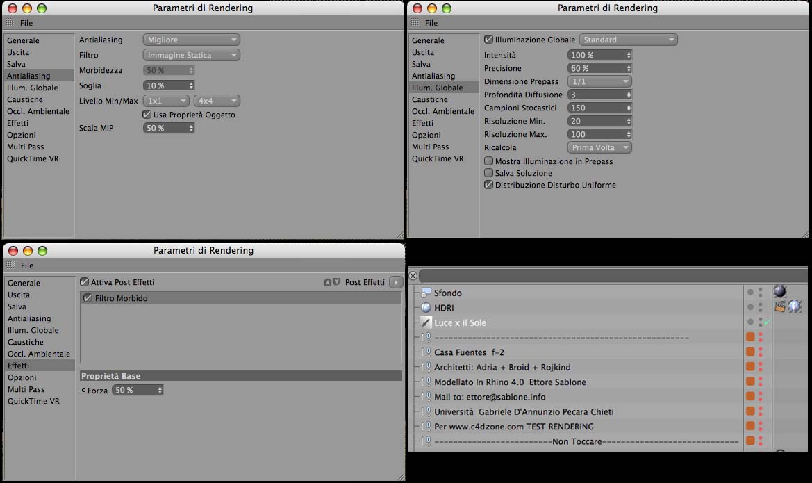 Allora. Ho provato a mettere delle impostazioni per le luci. Posto il risultato senza materiali e l'immagine delle impostazioni che ho preso come riferimento. La schermata in basso a destra non l'ho trovata,quindi non l'ho messa. Non ho messo neanche Filtro morbido e la percentuale di quella in basso a sinistra perche non ci sta. Consigli?