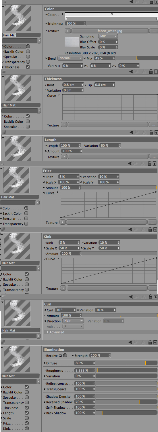 lo spessore è troppo piccolo... thickness .8 per inizio e fine è quasi un capello, mentre quelli sono peli spessi intorno al 5 o 6 millimetri. io di solito faccio quasi un centimetro, poi vedi tu.
