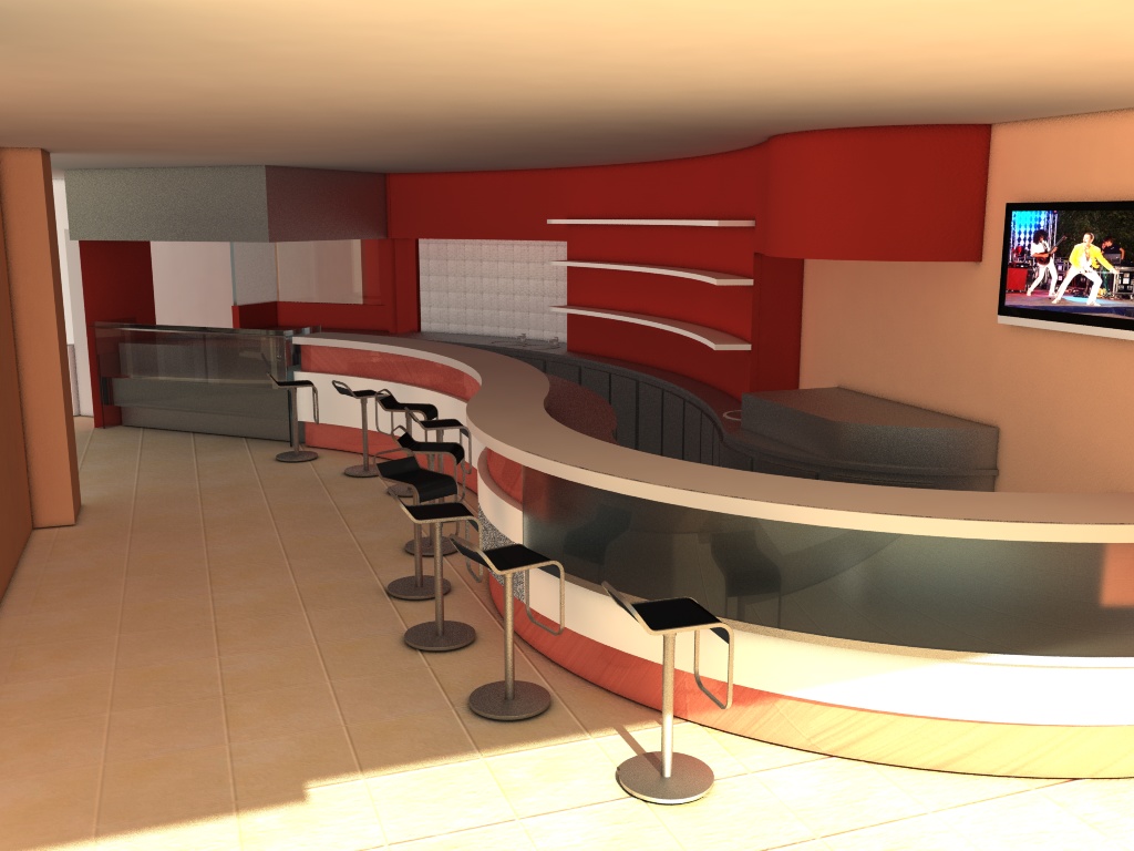 Ciao a tutti bellissimi, in questi 3 giorni di influenza ho lavorato su un bar interamente lavorato in Archicad salvo piccolissime cose. Gli sgabelli li ho scaricati dalla sezione ''modelli'' del sito . Il render che posto non mi garba affatto :nono nonostante le diverse ore di calcolo. Inizio con la descrizione della scena: