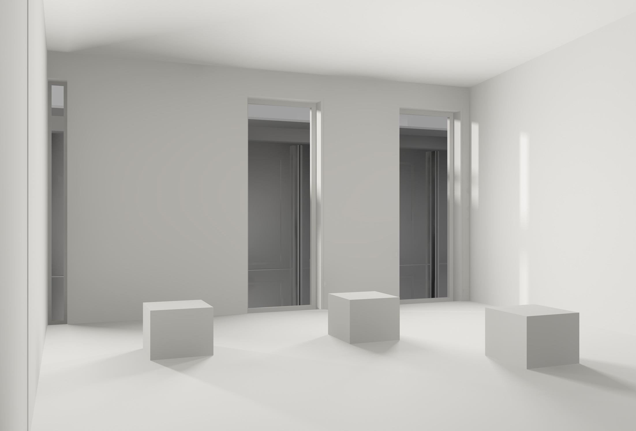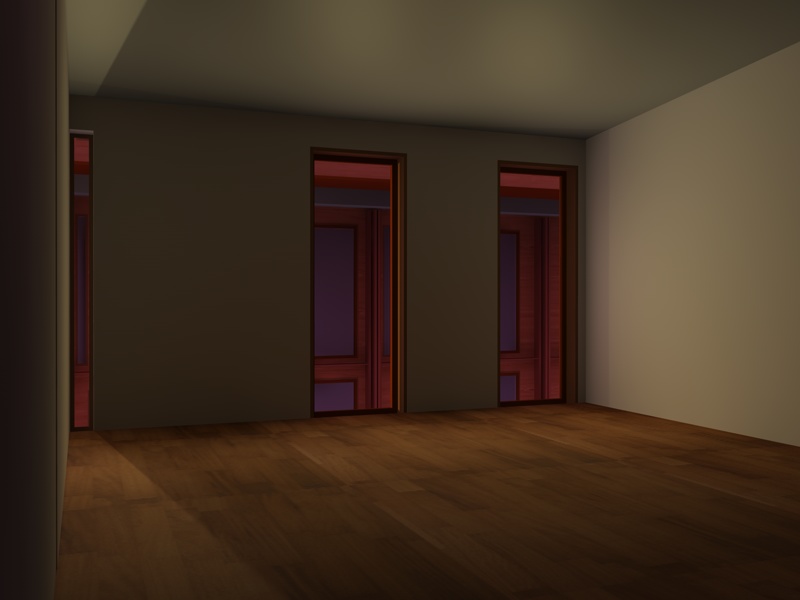 ti allego due rendering, il primo ha le luci area posizionate vicinissime al serramento, l'altra invece è vicinissima al filo del muro, se noti hai ombre diverse, sopratutto sulla parete che la telecamera guarda, vedi quale preferisci, e gioca con il colore della luce per simulare l'alba.