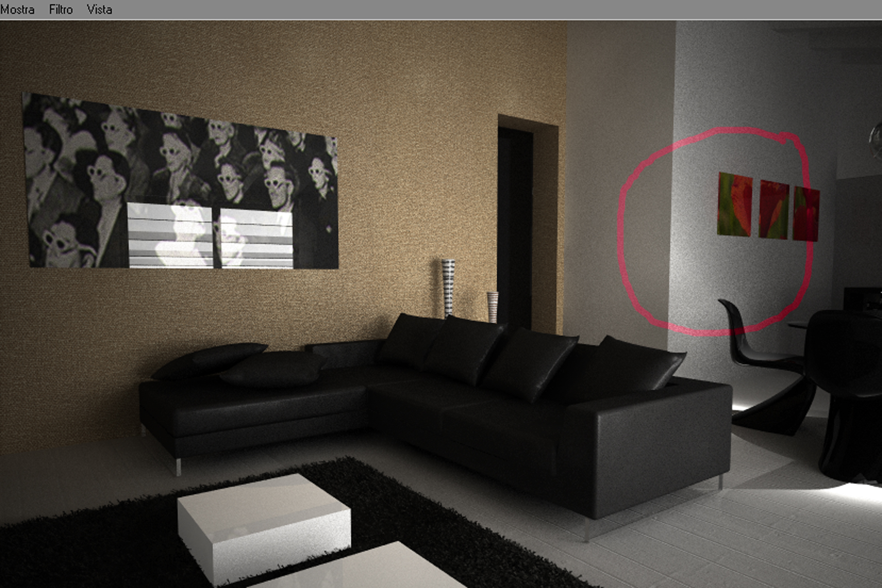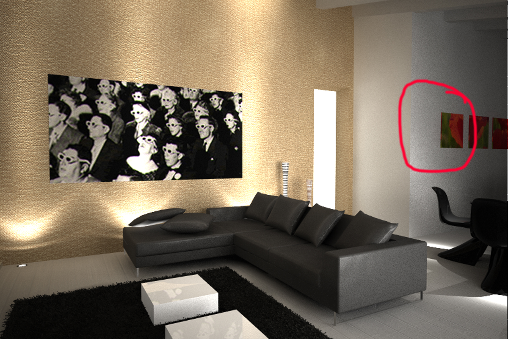In caso lo faccia ancora, fai un render avvicinandoti alla parete anche se secondo me sono le ombre perche' ci sono granate anche sul mobiletto bianco piccolo sul tappeto, il cubetto appoggiato...:)