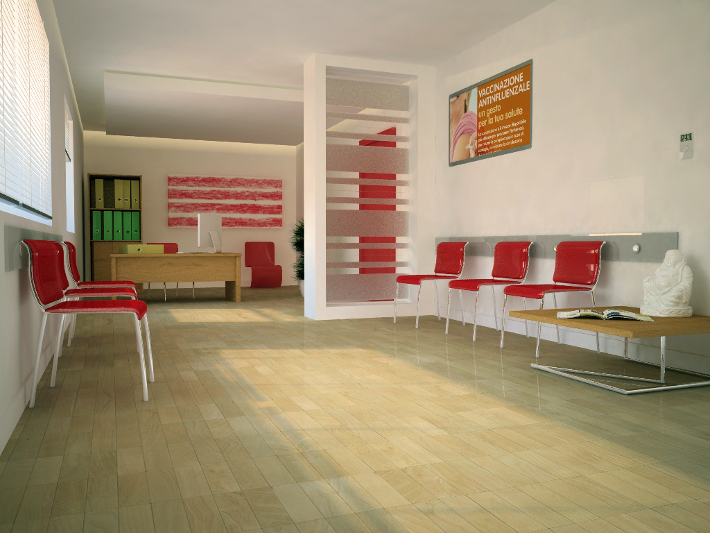 ok, ho sistemato un po di cosette, aumentato l' illuminazione e virata su un colore neutro (era troppo giallastra...concedetemi il termine). Ridotto il calibro dei faldoni, inserito una rivista (Focus) sulla sedia in primo piano e rimosso le luci che venivano dal controsoffitto.