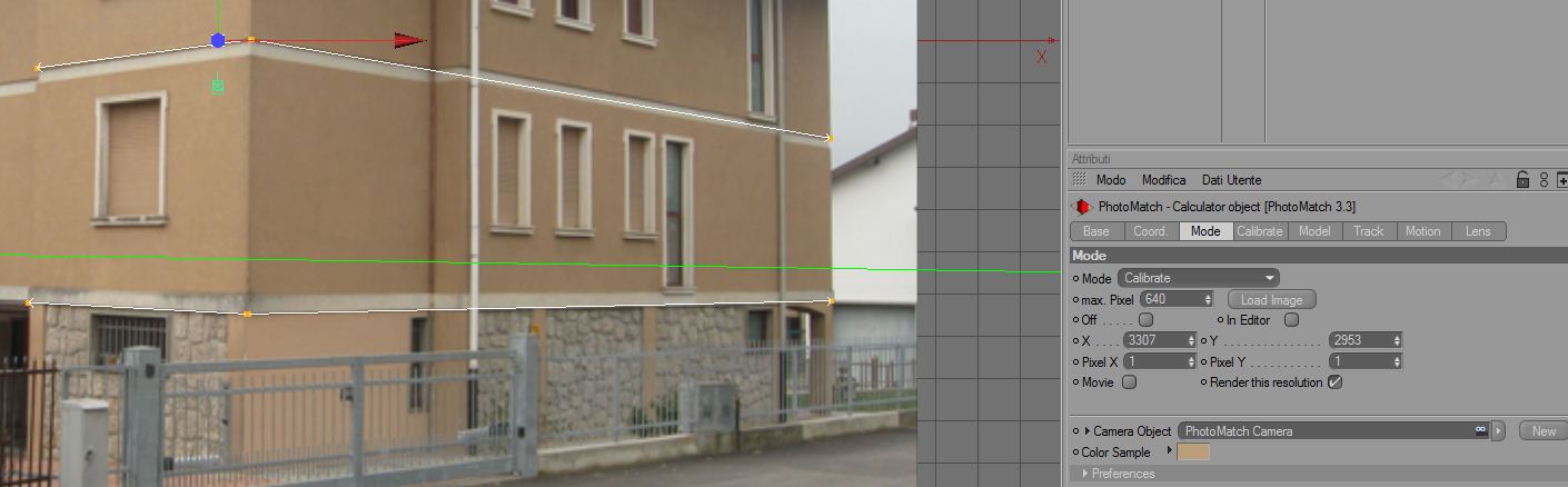 Devo inserire in una foto il sopralzo di una casa e ovviamente deve coincidere tutto quasi perfettamente...Ho impostato la calibrazione con 2 punti di fuga e dopo sono passata alla fase model, assegnando al cubo le dimensioni esatte di una parte di fabbricato e l'ho sovrapposto...Come potete vedere dalla foto, l'ultimo lato del cubo non è verticale come la casa, ma obliquo :?