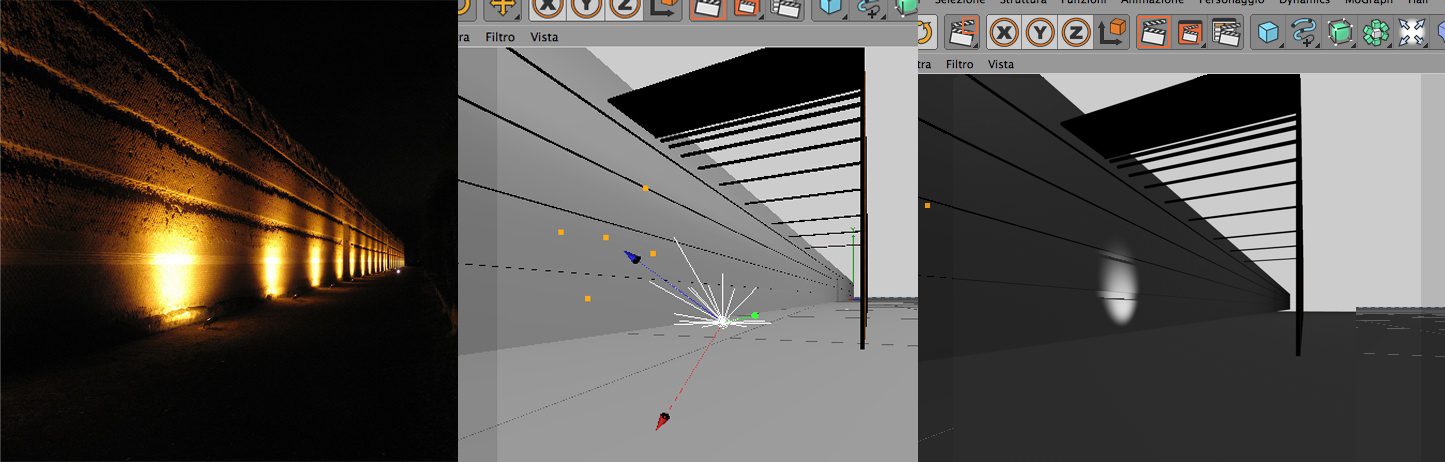 Salve, eccomi tornato ai vostri preziosi consigli. Mi trovo ad affrontare un fotoinserimento notturno. L'immagine da usare è allegata al post, con accanto il modello di cinema work in progress. Come si può notare le luci dei fari artificiali illuminano fortemente il muro entro un'area abbastanza ristretta, mentre il resto della superficie è avvolto entro un'alone indiretto che si degrada verso l'alto. Sicuramente esiste una definizione più tecnica per indicare ciò che sto faticosamento tentando di far apparire chiaro e comprensibile, ma spero possiate seguirmi senza troppo sforzo.