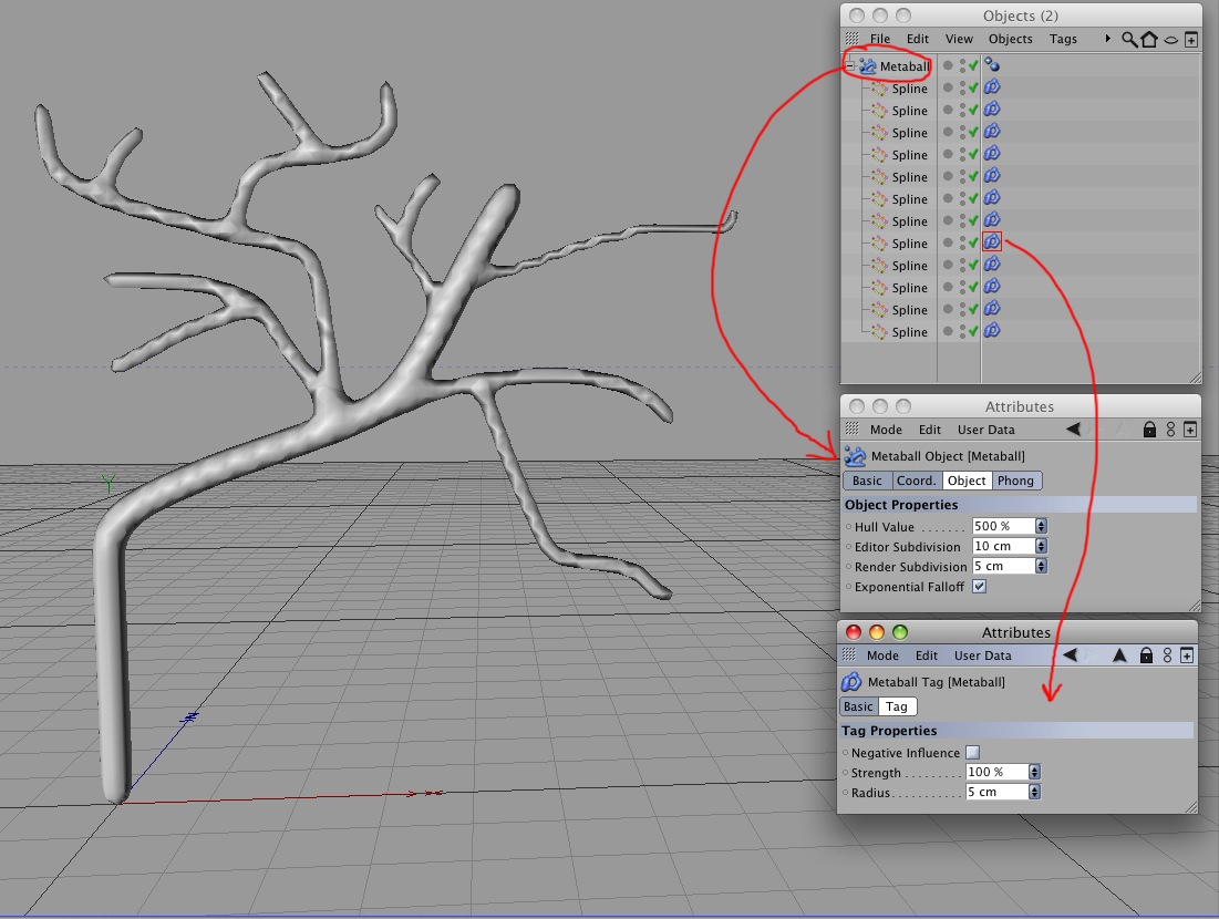 bhe dentro all'oggetto metaball si possono inserire anche le spline, quindi potresti disegnarti con varie spline un primo "ramo", mettere tutte le spline dentro una metaball ed usare (sulle spline) il tag Metaball per controllarne singolarmente il diametro. Certo, non è che sia proprio un lavoro di fino, ma potrebbe essere una base dalla quale partire...