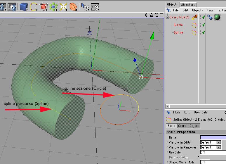 Dunque, osserva l'immagine... quelle indicate dalle freccie sono le due spline che inserite dentro una SweepNurbs, fungono uno (il cerchio) da sezione, e l'altra (quella chiamta semplicemente spline) da percorso.