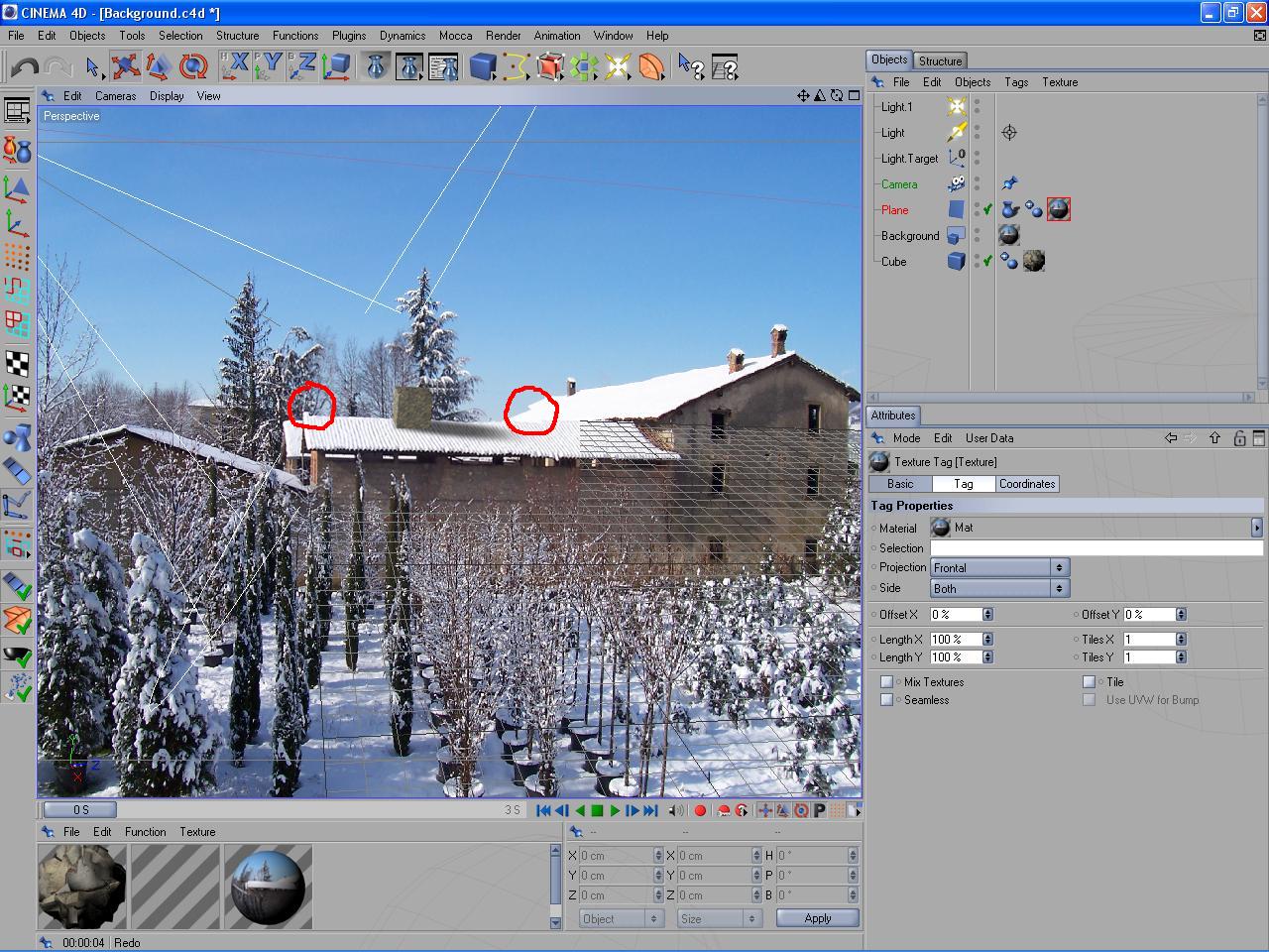 è tutto giusto, solo che non hai applicato la texture dello sfondo all'oggetto piano... devi applicargli appunto la texture usata per lo sfondo, con proiezione Frontal