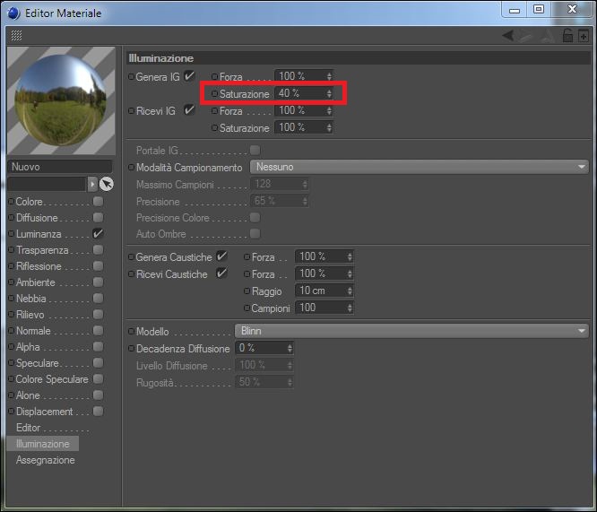 altra cosa, se mai l'hdri ti dovesse "sporcare" troppo dei suoli colori (tipo azzurro, verde ecc), c'è un canale nei materiali sul quale intervenire (vedi screen) e questo vale per tutti i materiali della tua scena (legno, prato ecc), se sporcano nel senso che diffondo troppo il loro colore intervieni qua.