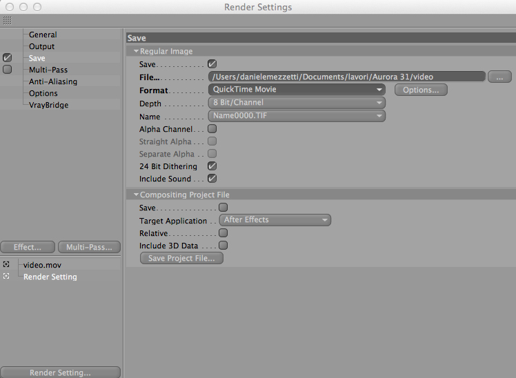ah aggiungo che ci stai facendo vedere i setting di video.mov ma quello attivo è quello che al lato è bianco e si chiama render setting... potrebbe essere quella la causa