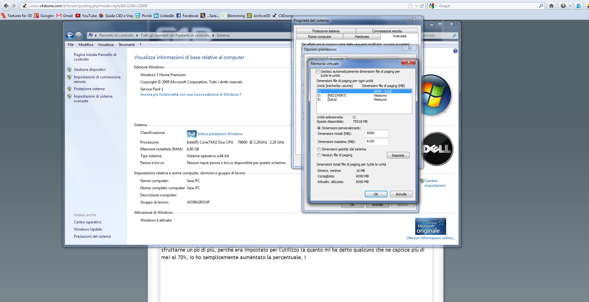 Dunque, quel che ho fatto con la ram del mio pc è stato semplicemente sfruttarne un pò di più perchè pare fosse impostato per non sfruttarla al 100% (mi pare fosse impostata a 4060 MB e il pc ne consiglia 6090). Allego uno stamp di quello che ho fatto..