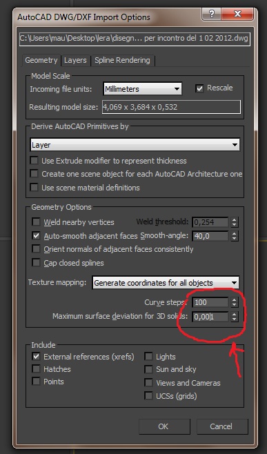 Agendo sul valore "Maximum surface deviation for 3d solid " nella finestra che appare quando si importa il DWG in 3d studio abbassandolo a 0.001 (di default è 0.01) si riesce ad aumentare il numero di facce che compongono gli archi.