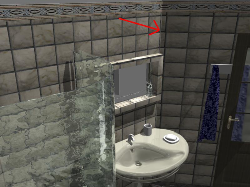Per distorsione intendo cio' che fa la texture sulla parete a 45° (esportato AllPlan), cioè il fatto che la dimensione della texture sulla parete orizz sia differente da quelle a 45°. Se ci fai caso, dove ho messo la freccia nell'immagine, la piastrella si deforma, si allunga. Dovrei per farle uguali, applicare una tag ad ogni parete e poi andare a ritoccarle una ad una, io invece avrei voluto (ovviamente), accorpare tutte le pareti e dargli un'unica tag. :???: