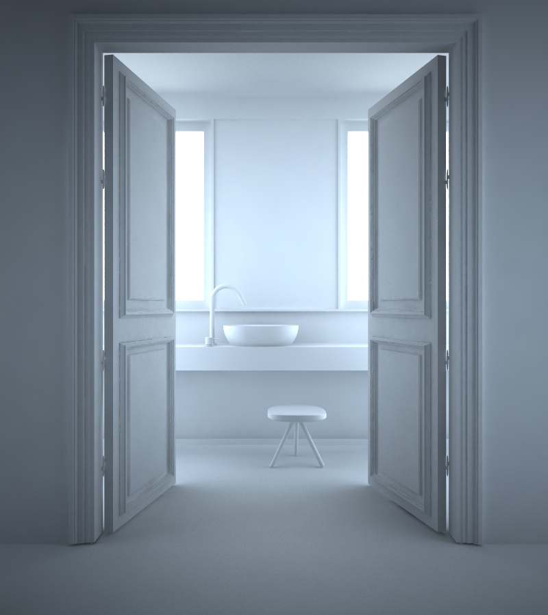 A me piace come effetto, anche se curerei un po di più la modellazione, un battiscopa nella stanza prima del bagno, manca la maniglia della porta e per quanto possa essere minimal la scena, il lavabo e il rubinetto dovrebbero avere, anche accennato, qualche tubo sotto il ripiano.