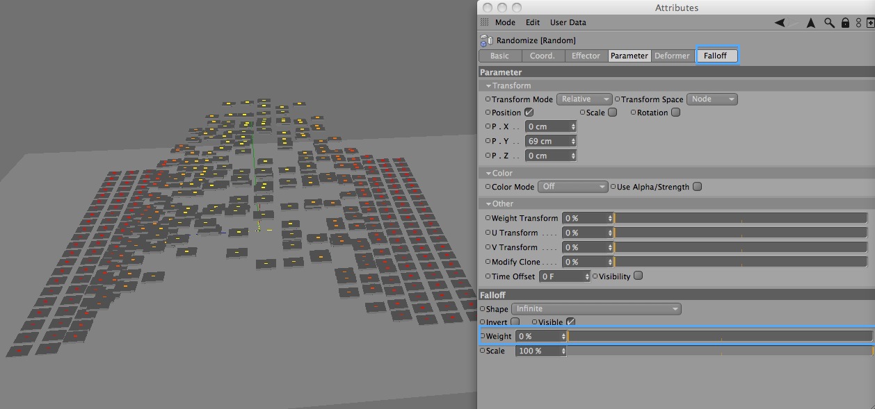 Esempio: hai una griglia di cloni, con uno Step Effector diciamo che li fai alzare al centro usando una curva nel Min/max. Il "peso" dell'effector è indicato dal colore da giallo a rosso: i cloni rossi non sono interesssati dall'effector mentre i gialli si. Se volessi ad esempio aggiungere un disturbo, in modo che l'effetto dello Step non sia così uniforme, potresti usare un Random Effector..ma se aggiungi un effector e basta, questo agirà su tutti i cloni. Per limitare quindi l'azione dell'effector ai soli cloni interessati dallo step, puoi passare il "peso" dello step all'effector successivo