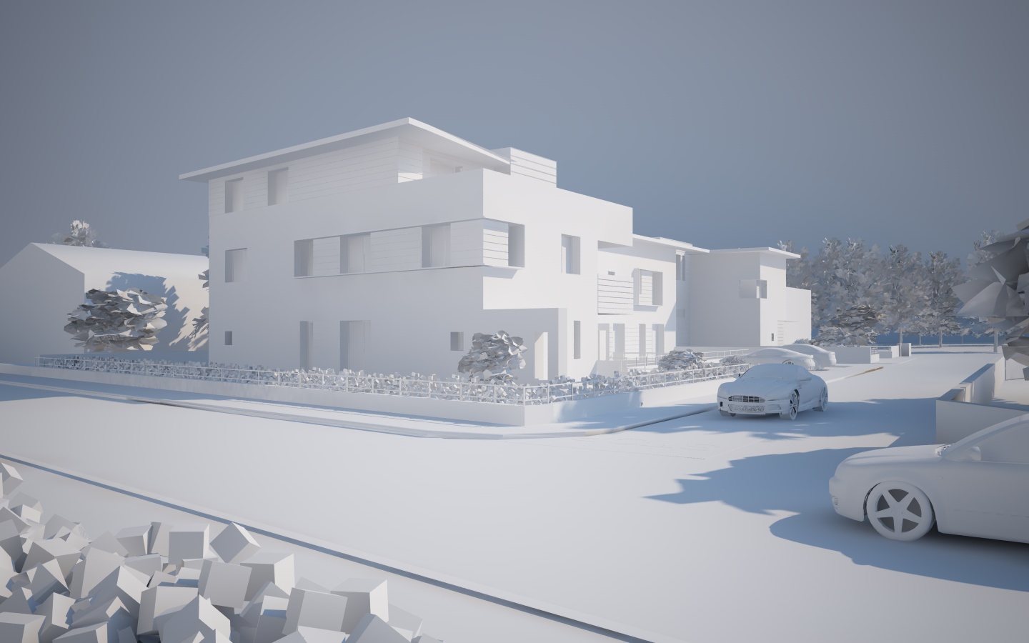 per l'intonaco ponso che quelle macchie siano dovute a bassi parametri di rendering, e condivido gli altri nel dire che le ombre sono sbagliate. Il fabbricato confinante lo farei semitrasparente, cosi si nota meno ma rende comunque l'idea.