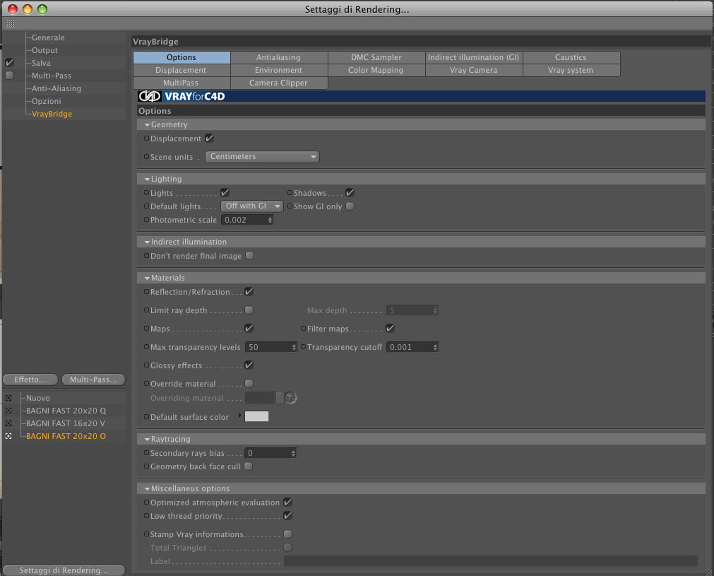 allego i parametri di render...in realtà lascio tutto impostato come di default, essendo la mia esperienza poca e le pretese basse. l'unica cosa che cambio è in genere i parametri della GI. e cmq li cambio copiando i settaggi suggeriti dal libro che ho comprato qua (il capitolo 9 del libro, quello su vray), per fare in modo che durante le prime prove i tempi di render siano il più rapido possibile.
