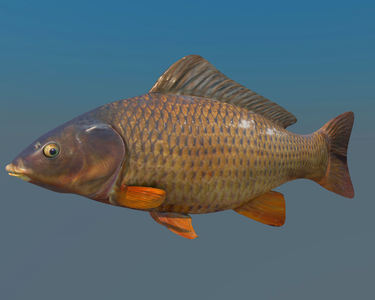 La texture del pesce è stata presa da una carpa vera appena pescata e quindi bagnata, speravo prendesse lo stesso effetto.