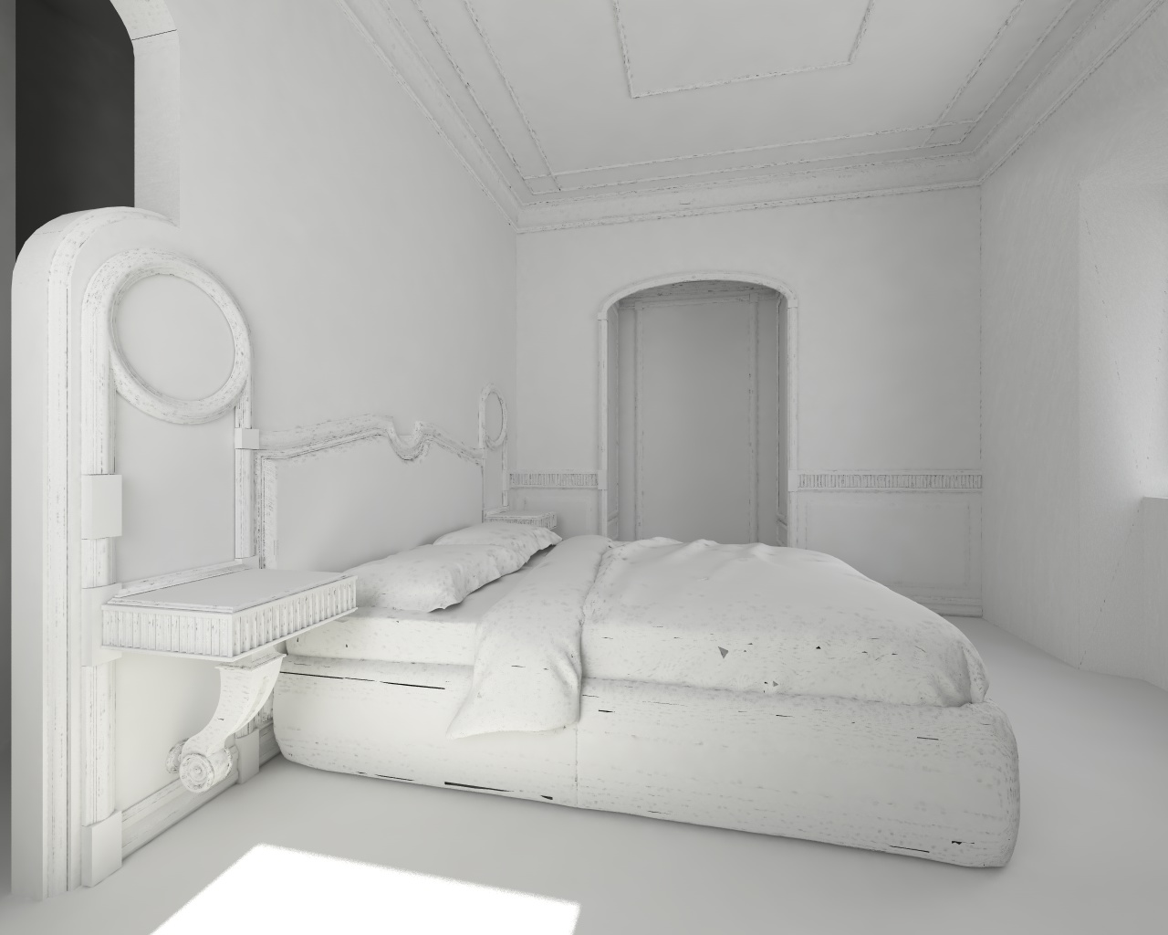 e terzo: io modello in autocad ed importo poi in cinema con 3ds, ma alcuni oggetti come quel corno sotto il piano del comodino quando renderizzo hanno dei triangoli mancanti che vencono neri; stessa cosa per il letto che però è un modello importato da B&B, mi crea un sacco di errori anche se quando lancio un render senza materiali senza vray e senza GI nel cinema di base questi errori non ci sono!!