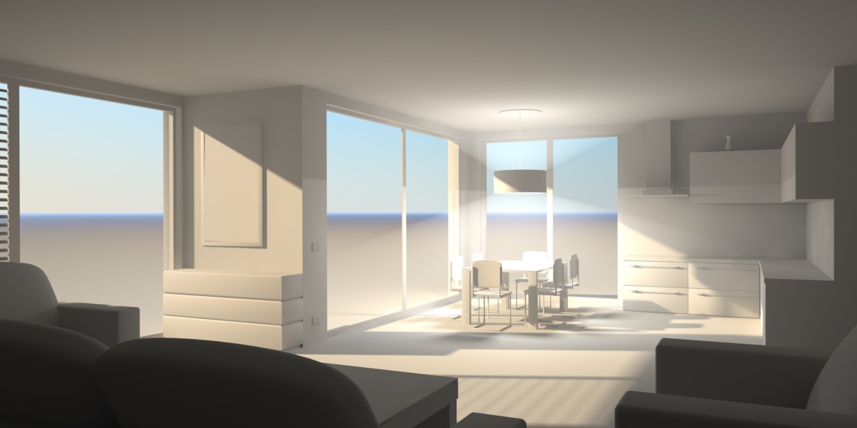 Ho modellato una scena ispirata ad un'immagine trovata sul sito maxon, la prima è illuminata solo con il cielo fisico, impostato alle 19 del 15 luglio, nella seconda invece, c'è un'altra fonte di luce, una sfera omni con ombre area posta nel lampadario.
