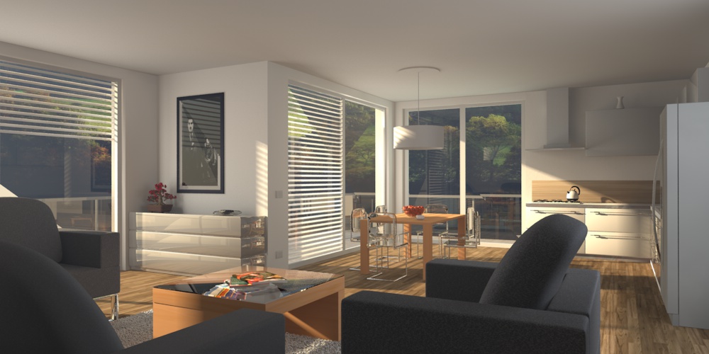 Ho modificato un po' la scena, aggiunto qualche dettaglio (vorrei aggiungere delle tende appena scopro come si fanno) e abbozzato i primi materiali per prima cosa devo migliorare i vetri e le poltrone, ma mi affido a occhi più esperti, voi che ne dite?