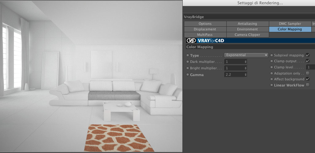 Lo stesso per il Linear Workflow. Non ho capito se scegliere LWF nei parametri di C4D influenza anche Vray o no, e se bisogna (e quando) scegliere LWF nel Color Mapping.