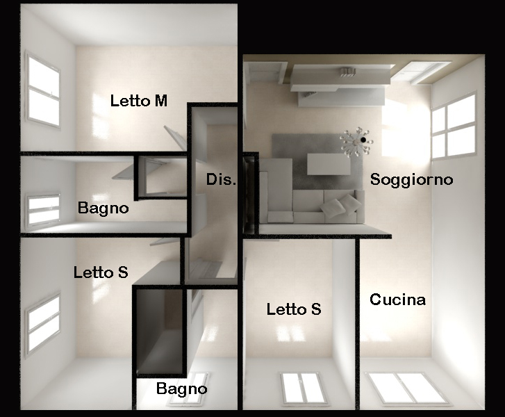 Lo scopo è quello di realizzare un paio di viste per ogni locale diciamo principale e cioè soggiorno, cucina, uno dei due bagni, letto m. pfiu