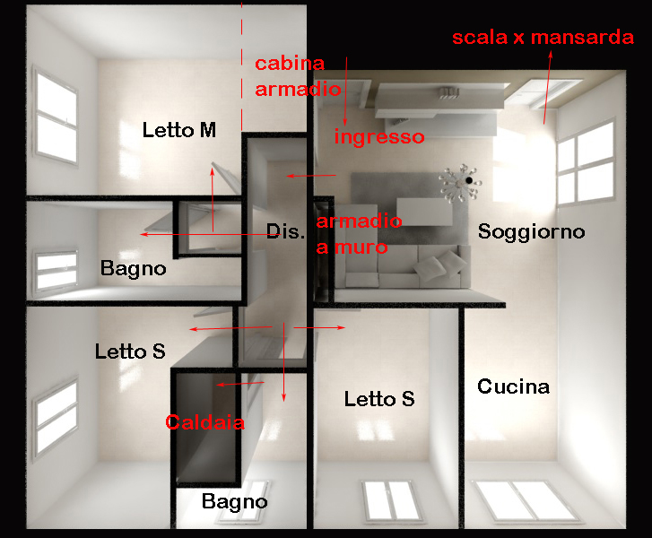 Per quanto concerne il discorso cabina armadio e vano caldaia avrei studiato un qualche soluzione in arredo come ormai si è soliti fare in ambienti simili. Tanto per dire, la caldaia si poteva tranquillamente inserire in un pensile della cucina, nessuno vedeva niente e non si doveva creare un'ingombrate nicchia apposita in muratura.