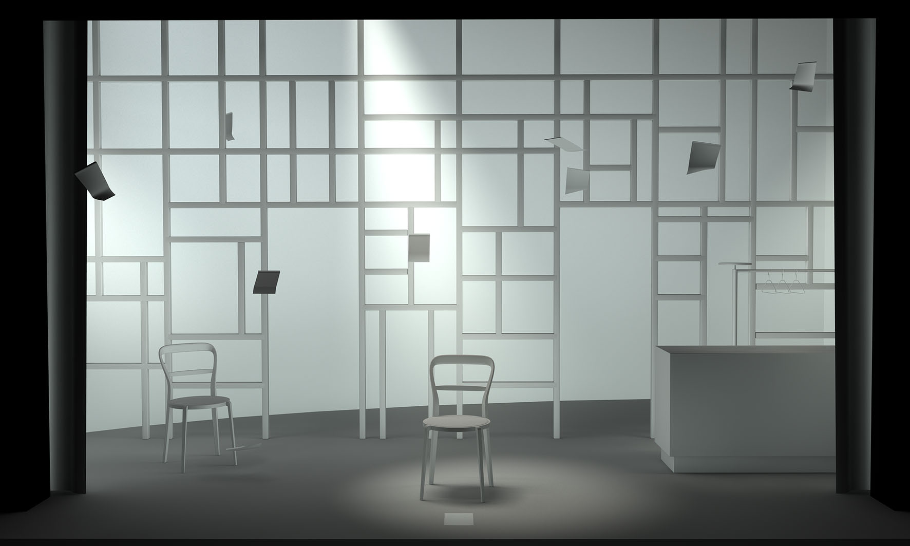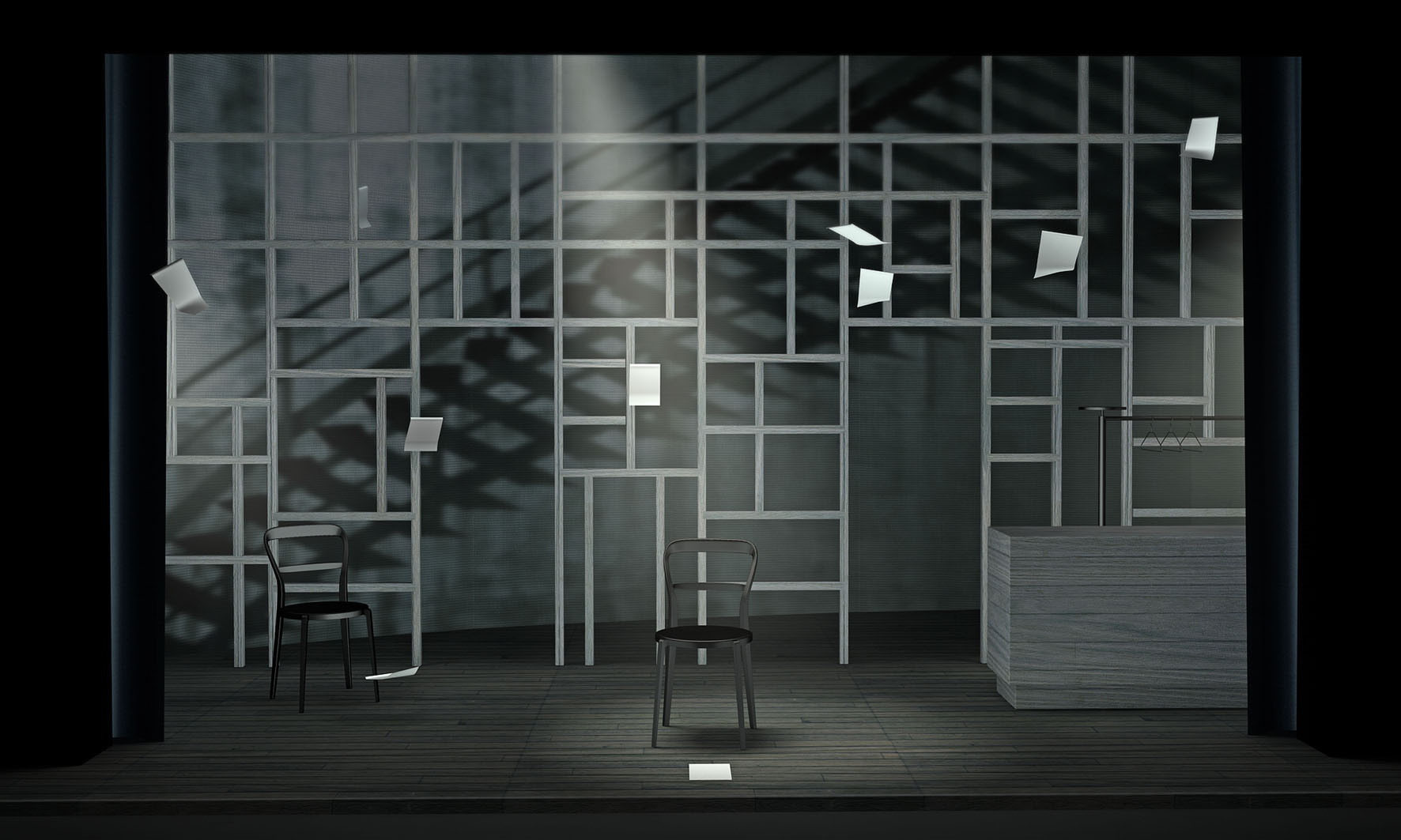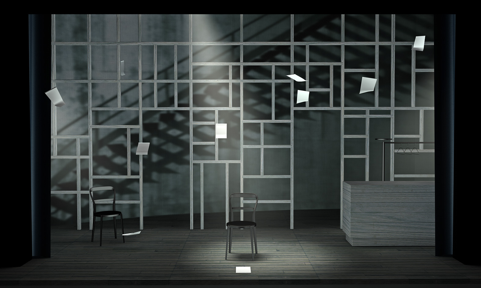 si è un dramma molto cupo, ma veramente imperdibile. La mia idea è quella di realizzare una sorta di ragnatala dove le due protagoniste (mamma e figlia) imprigionano gli ospiti del loro albergo. Facendola breve... le donne una volta identificata la preda facoltosa la addormentano e la buttano in un fiume nei pressi dell'albergo. Tutto "normale" fino a questo punto, ma un giorno arriva il figlio/fratello che se ne era andato per far fortuna e le due, non riconoscendolo, lo uccidono per rapinarlo. Nel prendere i soldi scoprono chi hanno ucciso e la manna si ammazza ect. Storia non certo allegra, ma assicuro piena di grandi pietre poetiche. Il bozzetto rappresenta l'ultima scena e i fogli che cadono sono i documenti che certificano l'identità del figlio appena ucciso......e incorniciano un dialogo tra madre e figlia da oscar!