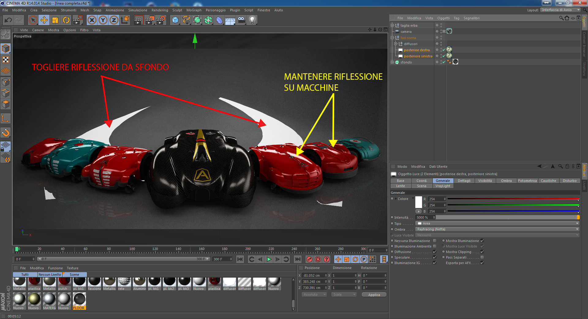come faccio a togliere la riflessione delle luci area selezionate solo dallo sfondo (mantenendo intatto il materiale di sfondo che mi permetta di avere la riflessione delle macchine) e mantenerla invece sopra le macchine?