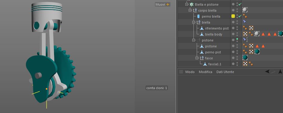 2° rendo ogni gruppo figlio di un oggetto clone: volano ( clone in modo schiera griglia); perno di manovella ( clone in modo lineare, verranno riposizionati successivamente); e biella e pistone.