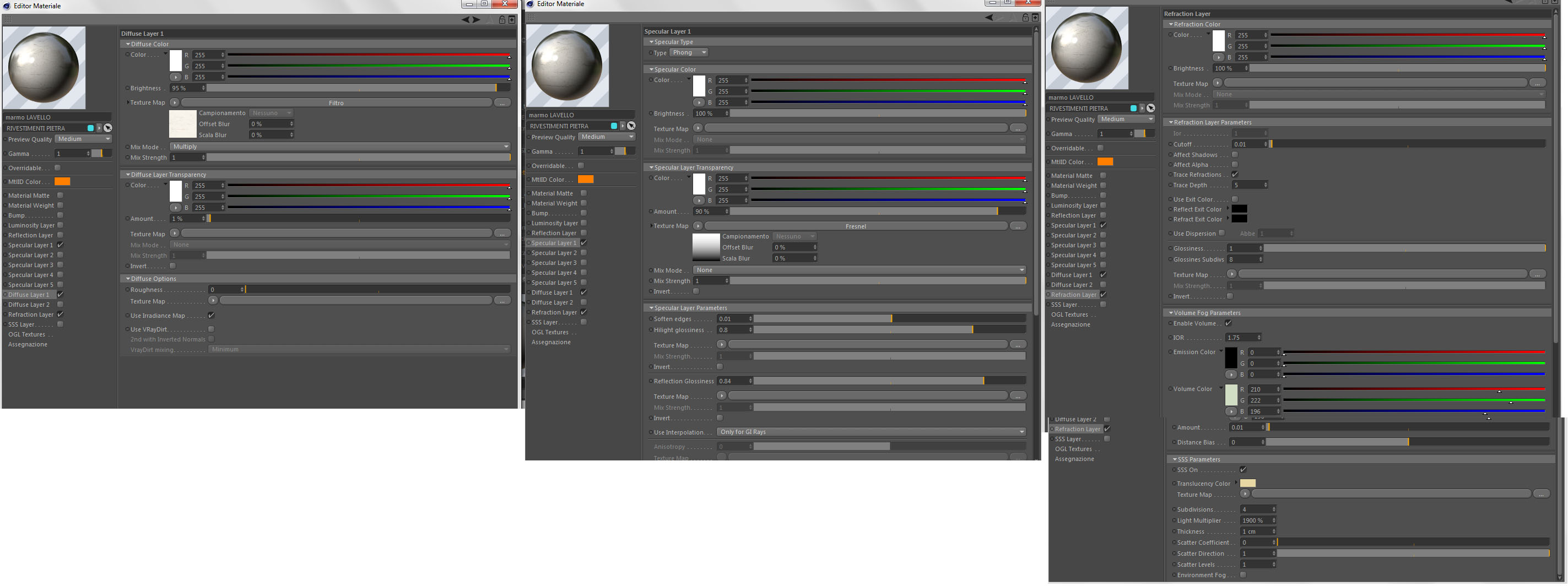 Per il marmo i canali da usare sono il diffuse, nel quale butti dentro la tex, ed uno specular, dove lasci solo la spunta sul reflection, togliendo quella dello specular.
