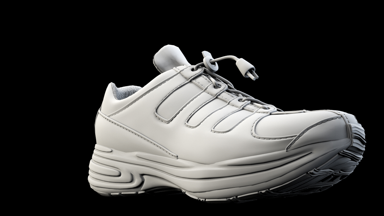 ottimo lavoro, se posso consigliarti renderei meno irregolari e quindi più lineari le zigrinature della suola in corrispondenza della punta; correggerei quel triangolino di stoffa - tessuto che parte dalla punta e va ad affogarsi per pochi millimetri nella gomma della suola , ma sono solo dettagli che magari nemmeno si notano.