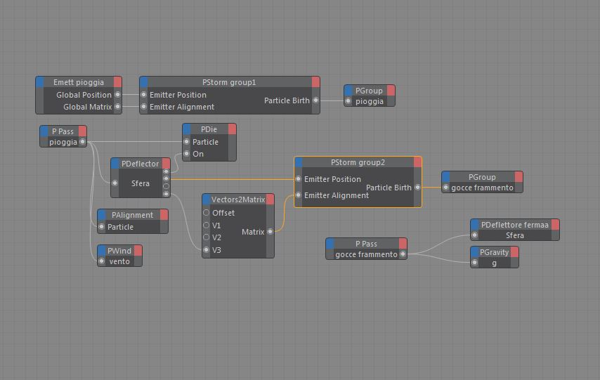 Il problema sta nel fatto che anche se sono comunque riuscito ad allineare gli emettitori di frammenti alla normale di contatto con la superficie, non mi è del tutto chiaro come passare i nodi normale evento e riflessione evento ( porte OUT del deflettore che emettono un valore "NORMALE" quindi credo "vettore" ) al porta global matrix del Pstorm per allinearlo all'angolo di incidenza dell'evento. Ho provato semplicemente collegando i nodi ad un "vettori a matrice", funziona ma emette i frammenti solo lungo la normale, inibendo la dimensione "fisica" dell'emettitore.