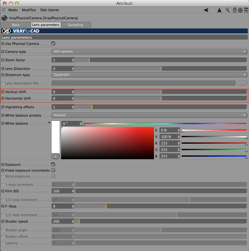 Dipende dalla versione di C4D....nella R14 io per esempio ce l'ho nei parametri della Camera Standard di Cinema4D e l'effetto funziona benissimo in editor!ilgioma wrote:Dovresti risolvere agendo su questi parametri. In pratica vai a simulare l'effetto che si ottiene in fotografia con un obiettivo decentrabile.