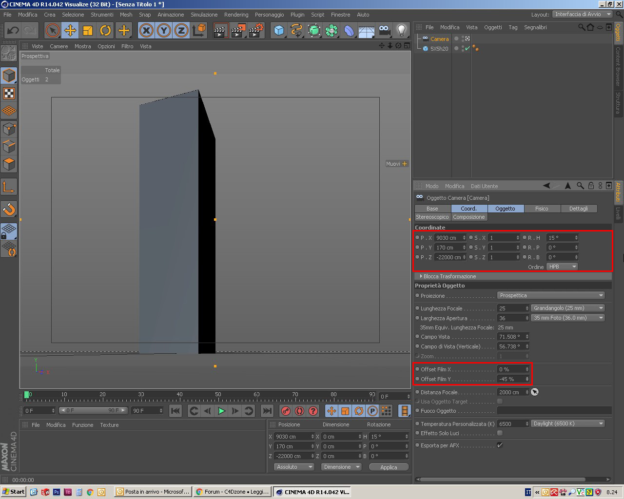 Per aggirare il problema si può intervenire sui valori di Offset Film Y della camera di Cinema e per farla funzionare è necessario che l'inclinazione della camera "valore R . P" sia a 0.