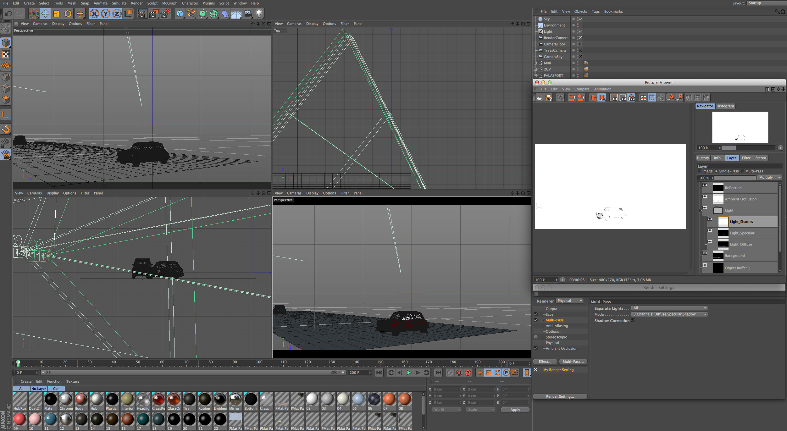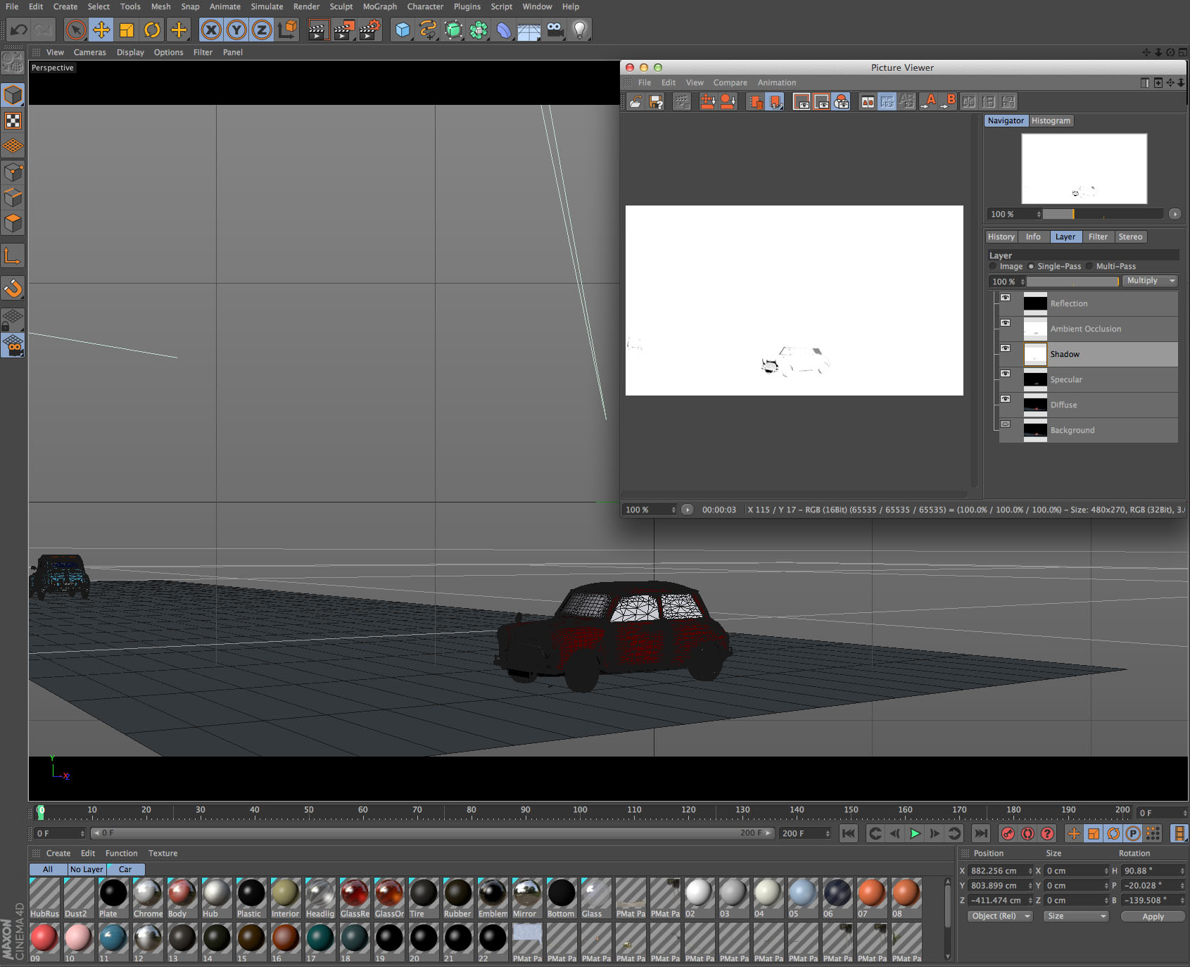 Vorrei semplicemente che l'ombra dell'auto si rifletta nel ground, ma le sole ombre che si vedono sono quelle (cosidette) portate.