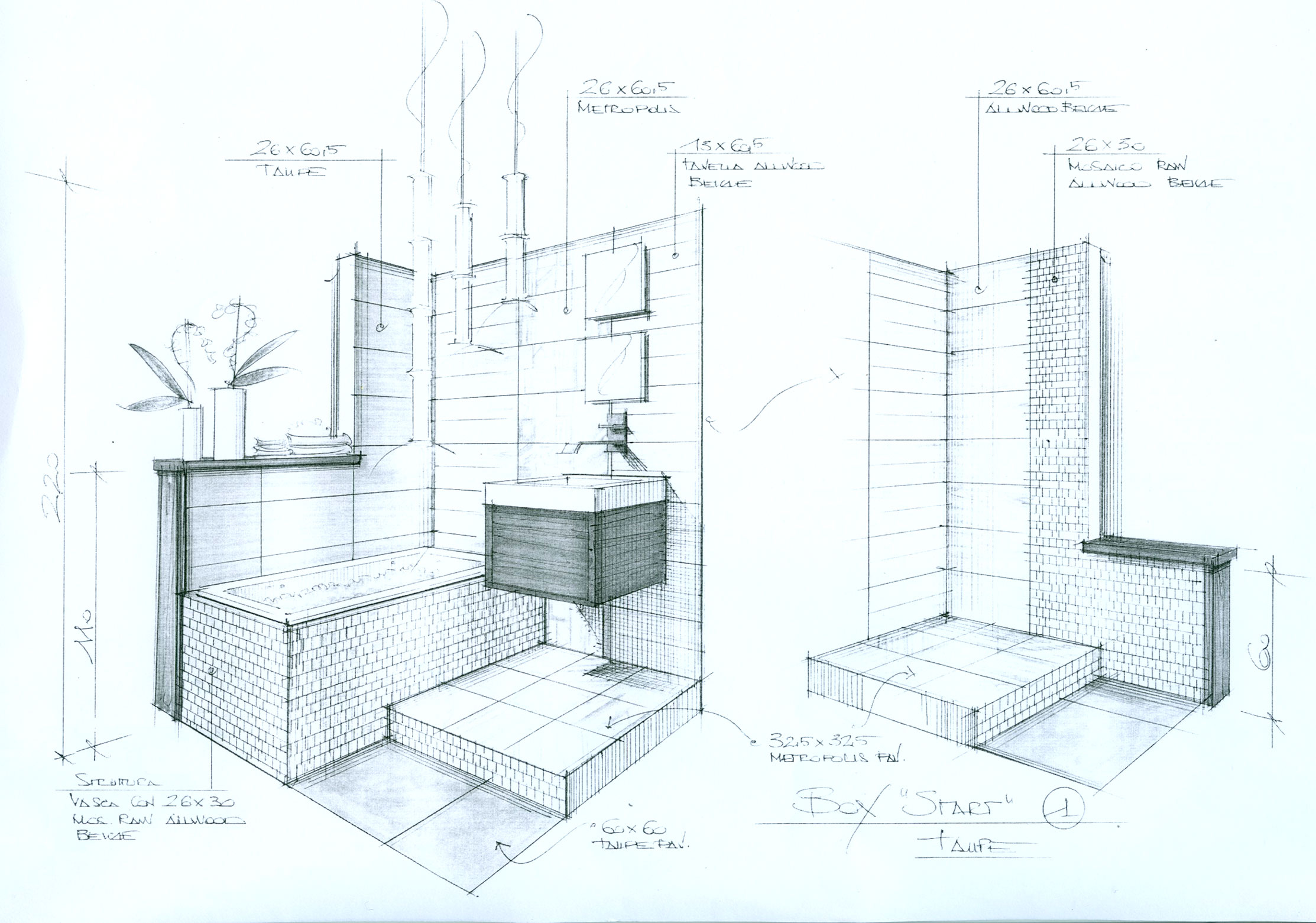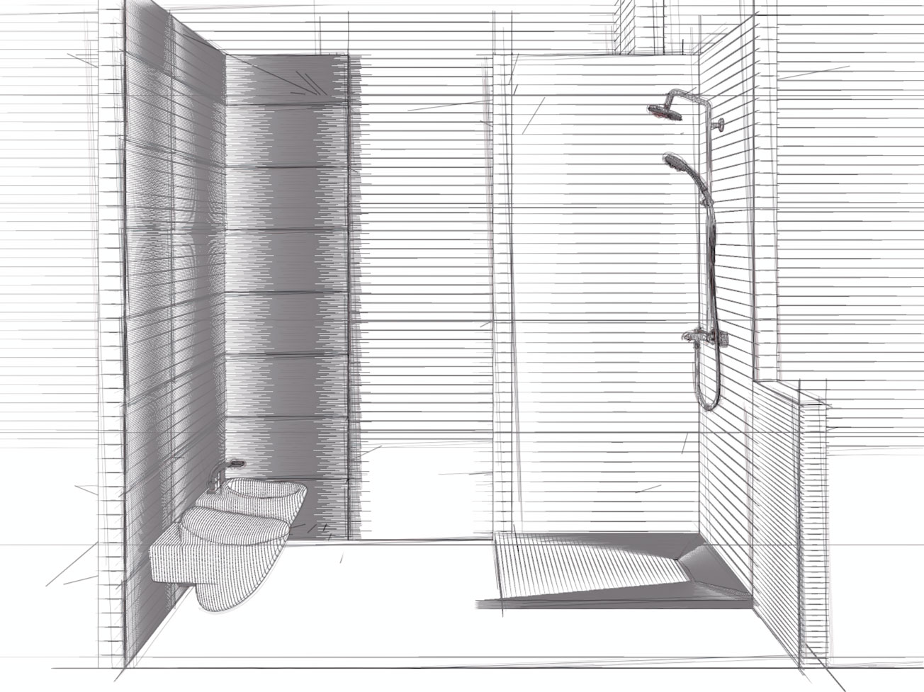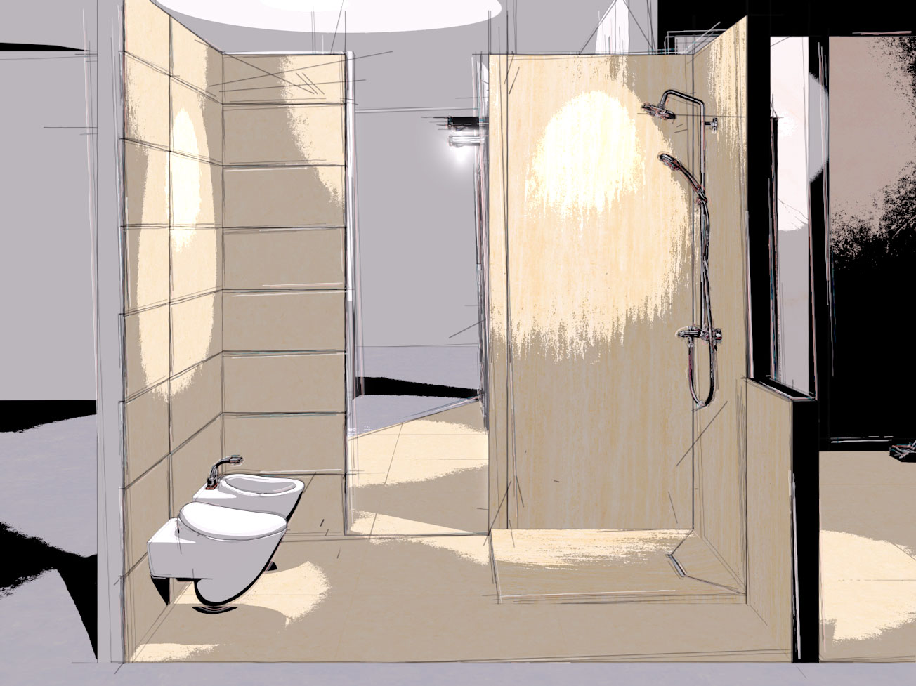 Non so schizzare in quel modo a mano libera, allora ho pensato che avrei potuto farli con Cinema 4D e Sketch and Toon, ma quel tipo di render non l'ho mai usato. Ho caricato un modello 3d di un piccolo box-doccia con piastrelle da usare come test e ho provato ad arrangiarmi con le istruzioni del manuale online, ma mi sono perso.