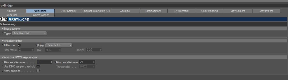 Ciao Grazie mille della risposta, ti posto i valori antialiasing, physical camera, vraylight. Come luci ho utilizzato una luce con target e due luci area però l'immagine è scura?