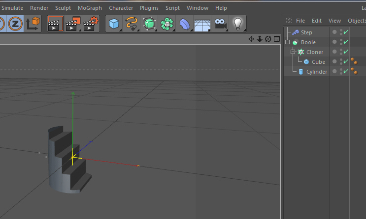 Praticamente dovrei far comparire il cilindro un pezzo per volta, così ho pensato di usare dei cuboni che si muovono in successione e ad una booleana, ma il risultato non è quello sperato. (vedi secondo allegato).