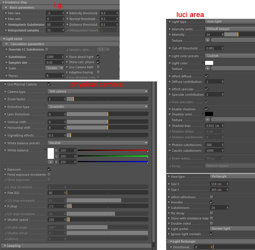 aggiungo un sunto dei parametri utilizzati,la scena è illuminata da physical sky (no sun)+3 luci area,la camera è una physical camera con DOF.