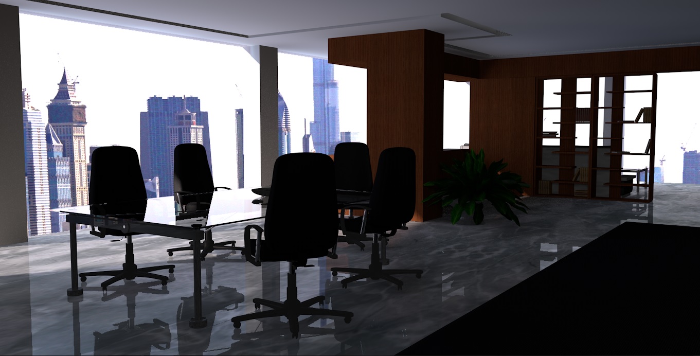 Ciao a tutti ho provato a cimentarmi con la realizzazione dell'interno di un ufficio per le riunioni ma il problema è che il risultato, pur gradendomi, non mi sembra ancora reale e non riesco a capire se dipende dalle luci o dai materiali. Devo ancora aggiungere altri dettagli (libri e soprammobili sulle mensole e forse un cellulare e un portatile sul tavolo).
