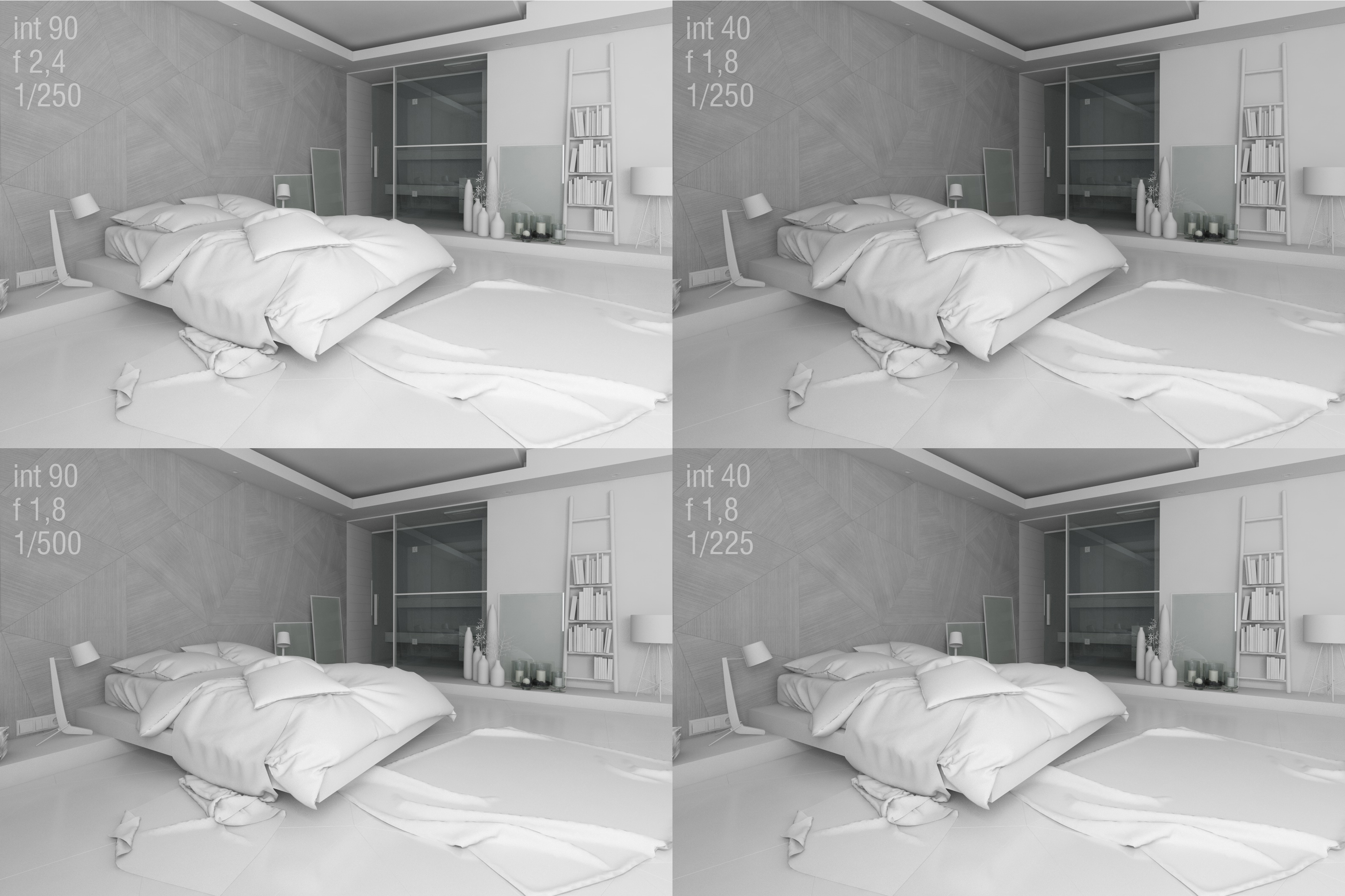 La prima immagine (int 90 f2.4 f1/250) è quella di riferimento. La differenza fra le prove non è abissale e mi rimane sempre una minima parte bruciata in primo piano sul tappeto (che dovrebbe poilivellarsi con i materiali), quello che però a mio vedere salta più all''occhio è la caduta di profondità dovuta all'appiattimento dei neri e al tendere al grigino della parete sul fondo...
